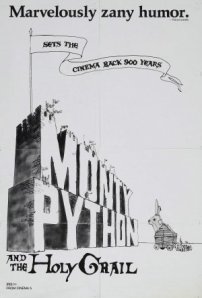 We saw this movie at the Century Theater on Las Tunas, in San Gabriel, on a rainy overcast day. This must have been a weird summer, because in So Cal you don’t get a lot of those kinds of days in the summer. I had heard about the movie from someone, but I don’t remember who suggested it. We could barely get PBS on the TV so my knowledge of Monty Python was next to nothing. The only UHF channels I remember seeing as a kid, were Mexican stations that carried the bullfights. My Dad seemed to really enjoy stories about bullfighting, I think he must have read Death in the Afternoon. Anyway, I somehow got him to go with me to see Holy Grail. The poster for the movie at the theater looked really cheap. I remember it was basically a line drawing and the title, but my Dad did laugh at the tagline comparing the movie to Ben Hur. It was a double feature and we first sat through a George Segal comedy called “Where’s Poppa?”. We both laughed at some of the broader bits of that forgotten gem and hoped we would enjoy the feature that brought us there in the first place.