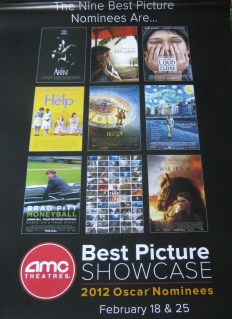 This is another movie that appears to have polarized critics. Some have loved it and others have described it as mawkish 9/11 porn. It is certainly different and there are some things about it that I like a lot. Here is a trivia question you could probably win a bet or two on, “Which acting nominee fails to speak a single word in their performance?” Many people will be suckered in, thinking that the silent film “The Artist” is the answer, in fact the correct answer is Max Von Sydow in this film. He is one of the great things about the movie. There is also a wonderfully muted performance by Jeffery Wright in the last part of the film. I had problems with the way the story develops and the concept. There is a slight remedy of some of my objections in the last section where Sandra Bullock’s mother reveals her involvement in what is going on. It is reassuring and also a bit of a cheat. This is the poster that we won in another of the trivia contests during the long day.