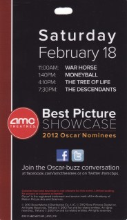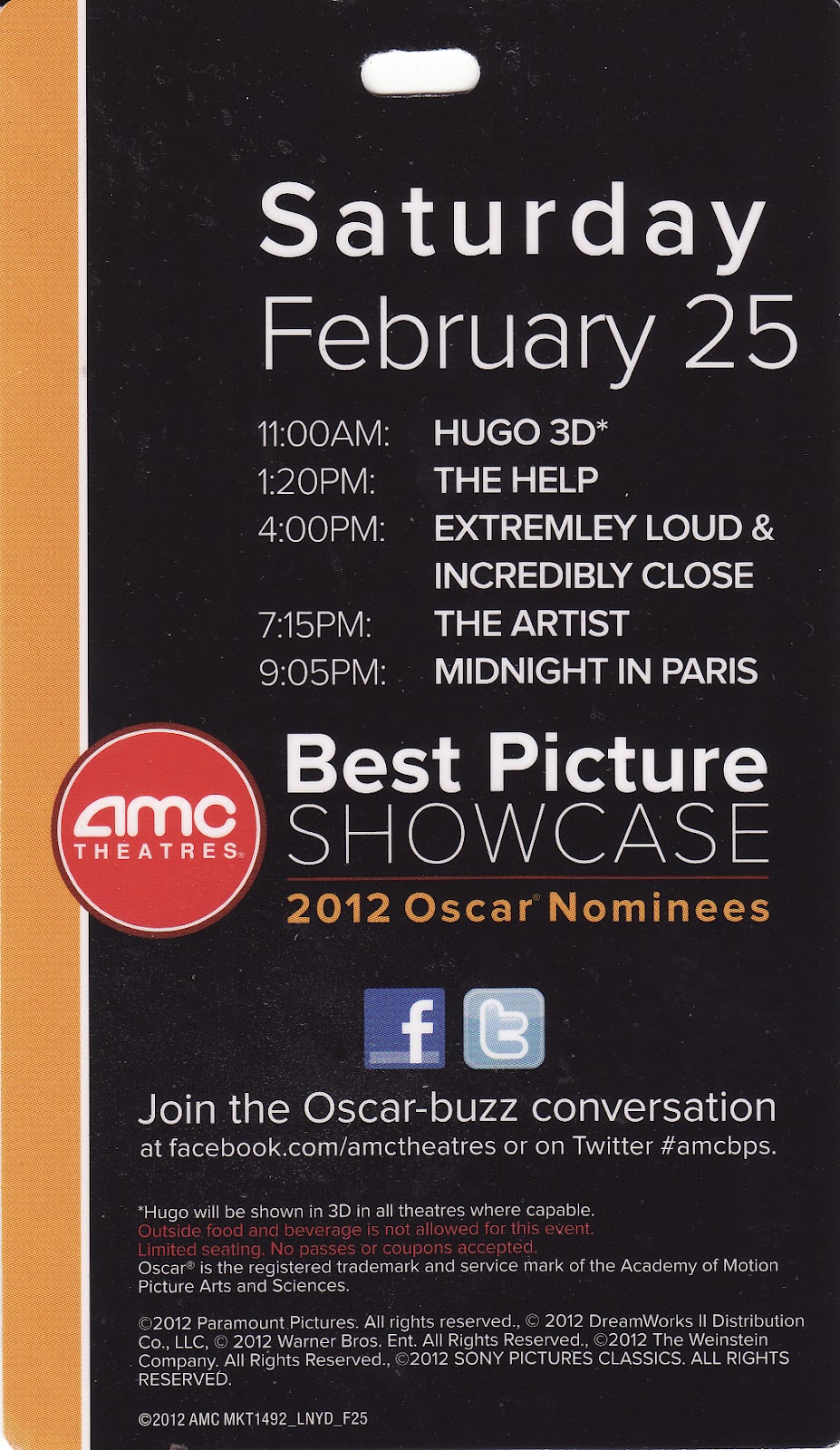 Tomorrow, we have “Hugo”, “The Help”, “Extremely Loud and Incredibly Close” , “The Artist” and “Midnight in Paris”. For my previous comments on two of the films you can click on the poster below. I have heard great things about the other three and it looks to be a very pleasant day.