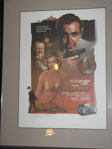 There are a couple of additional elements to mention that make Goldfinger the top Bond film of all time. The image of Shirley Eaton, splayed out on the bed, naked but covered in shiny gold paint, will certainly leave a deep impression. It is sexual and deadly at the same time. That is what Bond has always been about.This became another iconic image from the movie series and perhaps next to the gun-barrel title view of Bond, the most recognizable visual image from almost any movie. It was featured on the film’s poster, on magazine covers, and in parodies ever since. It is a backdrop for the titles of the film as well. And since I have just mentioned Miss Eaton, I’ll share an image with you that should make you all a little jealous. The image here is of a custom printed poster painted for a group that sold these types of Bond memorabilia. It is hanging on the wall in my family room right now with about eight other posters from the Bond movies, but if you enlarge it a little you will see that in addition to the artist signature on the print, it has the signature of the golden girl herself.