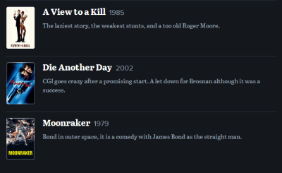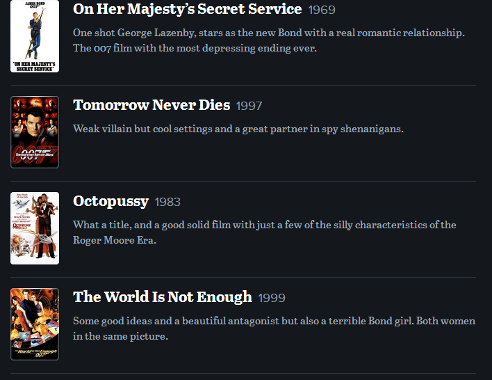 From then on, Bond is both funny and heartless. He can be moved by the right woman and has no compunction about betraying the wrong one. Assassins come in all forms, blind trigger-men, duplicitous geology professors, and creepy crawlies in the middle of the night. He defeats them all but not always with ease and sometime brutally. Bond has had hundreds of great lines, but one that espablishes his character comes from this movie.