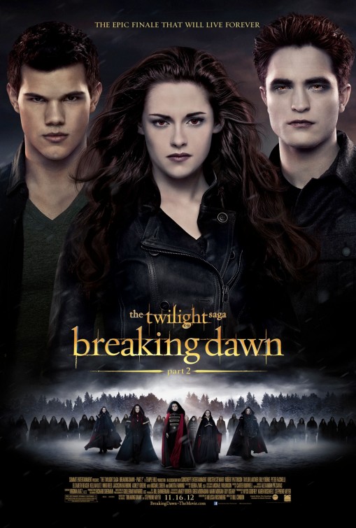 I’ve read all the books once, and seen each of the movies at least once. From that I can say that the film stays true to the book and manages to make at least one thing about the book better. The end of the film had a coda that was unnecessary, with the umpteenth pledge of undying love between Bella and Edward. Whatever it is that the “Twihards” are projecting on to these characters, continues to escape me. The love story of these two appears to have been replaced by the characters in a “Twilight” based fan fiction that has become extremely popular this last year. I look forward to seeing “Fifty Shades of Grey” and all it’s sado-masochistic sex being played out on the big screen in a hard “R” rated film. I think it would be most appropriate for Pattinson and Stewart to play the leads there as well. Maybe we will get some real characters having real sex and we can leave the mystical sparkling vampires to their own place in cinema history.