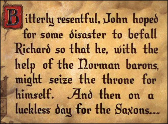 Bitterly resentful, John hoped for some disaster to befall Richard so that he, with the help of the Norman barons, might seize the throne for himself. And then on a luckless day for the Saxons…