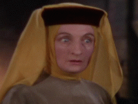 There were only two prominent roles for women in “The Adventures of Robin Hood”. Bess is the chaperone/female companion and servant to the Lady Marion. She is a wise older woman with a big romantic streak. She serves as comic foil and confidant at various points in the film. The dalliance she undertakes with Much after the banquet in the forest allows her to serve as a conduit between Marion in the castle and the band of outlaws. She is played by Una O’Conner, who pops up in Universal Horror movies and Warner Brother Costume dramas on a regular basis.