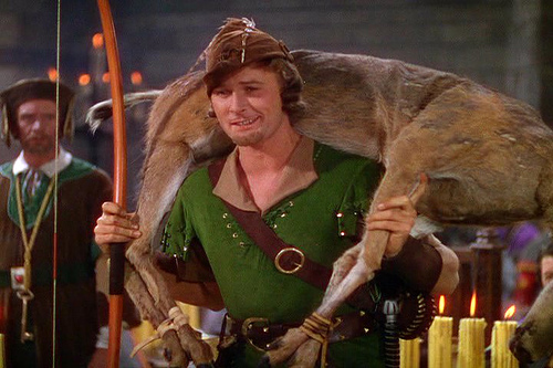 Robin Hood, as portrayed by Flynn, is the very definition of a swashbuckling character. He is indifferent to risks and seeks adventure by challenging the injustices inflicted on England by an illegitimate ruler. Flynn gets three or four great entrance moments in the film. When we first see him, his horse bounds over a hedge and pulls up in time to rescue the desperate Much, the Millers son. His confronting of the diabolical Guy of Gisbourne, sets the tone for serious drama leavened with a scoundrel’s humor. He is clearly established as a good hearted man who is offended by the casual injustices he sees popping up around him. He could stay detached and as Marion says at one point “live in comfort” but that is not his way. Backing off from conflict is not his way either. He invites it by taking the poached deer that was to doom Much, and delivers it in grand style to Gisbourne and Prince John. He swaggers into a feast filled with enemies making plans to put John on the throne, and pushes their soldiers out of the way with the antlers of the deer slung over his shoulders. He presents it as a gift from the King he remains loyal to, in a direct slap in the face to the barons gathered to depose him.