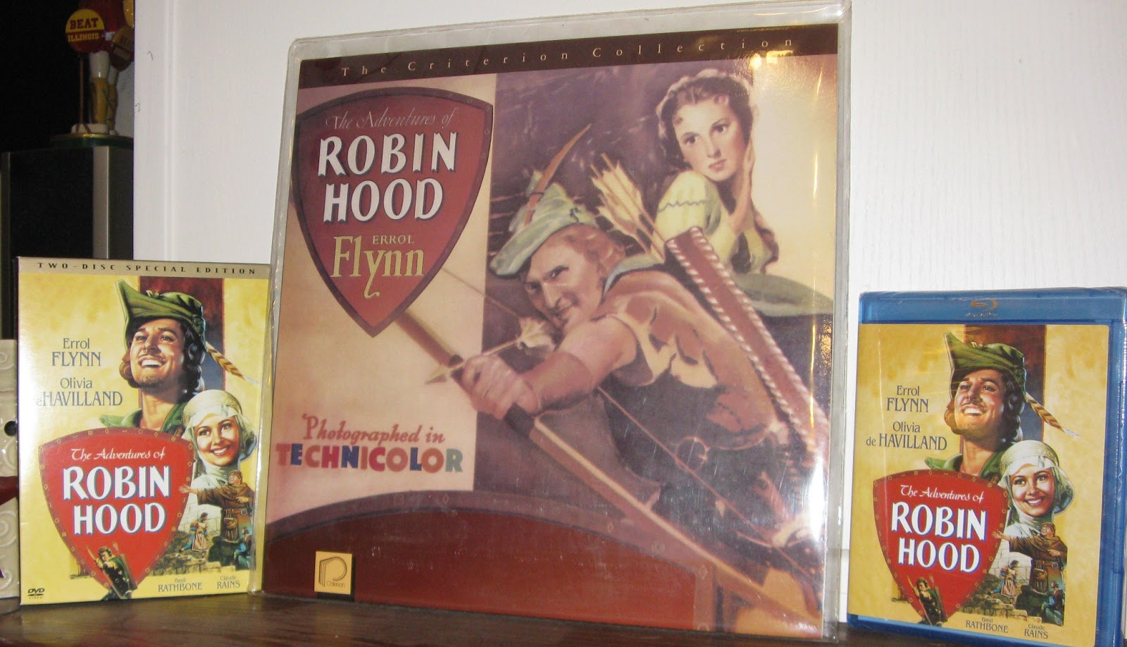 I have a long history with the home versions of The Adventures of Robin Hood. A couple of years ago I donated all my VHS tapes to the Goodwill, so I do not have my purchased VHS version any more. I do have the copy I taped off of television in the early 1980s out in a box in the garage. I should dig it out, I’m sure it is an interesting artifact if it was done the way I think I remember doing it. There was a local station (KTLA) that ran movies in the evenings with only a couple of commercial interruptions. I usually let the commercials run out of gratitude for the limited breaks, so it will have some interesting TV history on it. I purchased my first Laser Disc player in 1990 and shortly after, invested in the Criterion Edition of the Laser Disc you see above. It has the original commentary track from film scholar Rudy Behmer that has been included on the DVD and Blu ray releases subsequently.
