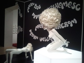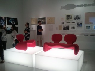 Friday night, I re-watched 2001:A Space Odyssey in anticipation of the trip to the LACMA. I was sure glad I did because the highlight of the exhibit for me was the material presented on what I think is his greatest film and certainly my favorite Kubrick film. There were two sections of space devoted to the 1968 epic, it included a replica model of Discovery hanging from the ceiling as well as costumes and masks worn by the performers in the “Dawn of Man” sequence. In the center of the first room were pieces of furniture found on the orbiting space station visited by Heywood Floyd on his way up to the Moon.