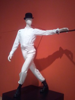 There was a small alcove room that was playing a series of film clips and highlighting the music that was used in the films. It was a little claustrophobic, and while it was interesting, I did not stay through the whole loop . To gain entry to that room, one had to move through the section that featured material from “A Clockwork Orange”. There was a series of newspaper articles about a British man who had modeled his behavior on the droogs from this film. Kubrick had defended the movie vigorously from criticism over the violence, but after the events that occurred in the real world he held the movie out of circulation in Great Britain for many years after. In another display, one shelf over were all the mock up newspapers from the film, covering “Alex” and his trials and subsequent rehabilitation. It was an interesting contrast to see the two sets of news right next to each other.