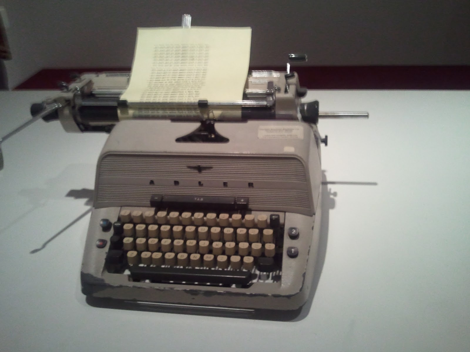 To the right here is a close up of a miniature set reproduction of the War Room from Dr. Strangelove. It looks amazing and you should know that the chairs around the table are about the size of a paperclip. The screens in the display were actual scenes on display from the screens in the movie. The technical material here was the most involved in the exhibit. Cameras and lenses and small script elements made up most of the display. It was on one end of the entry gallery and right next to it was the material on Lolita. There were a number of photos frames of Sue Lyon in costume and on the set. They were all in color and a magnifying glass on a fixed rail allowed the viewer to scroll down the line examining them in much the way a director or photographer like Kubrick might have in making tiny decisions about costumes, make-up, props and lighting.