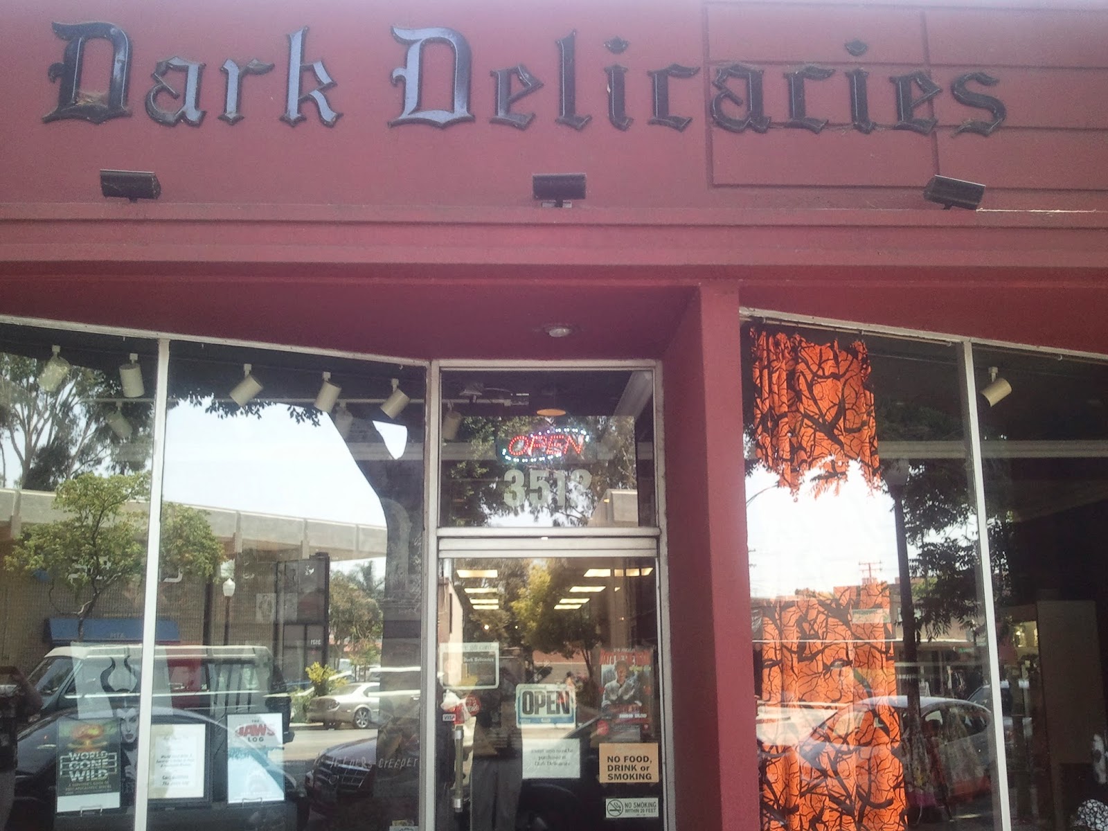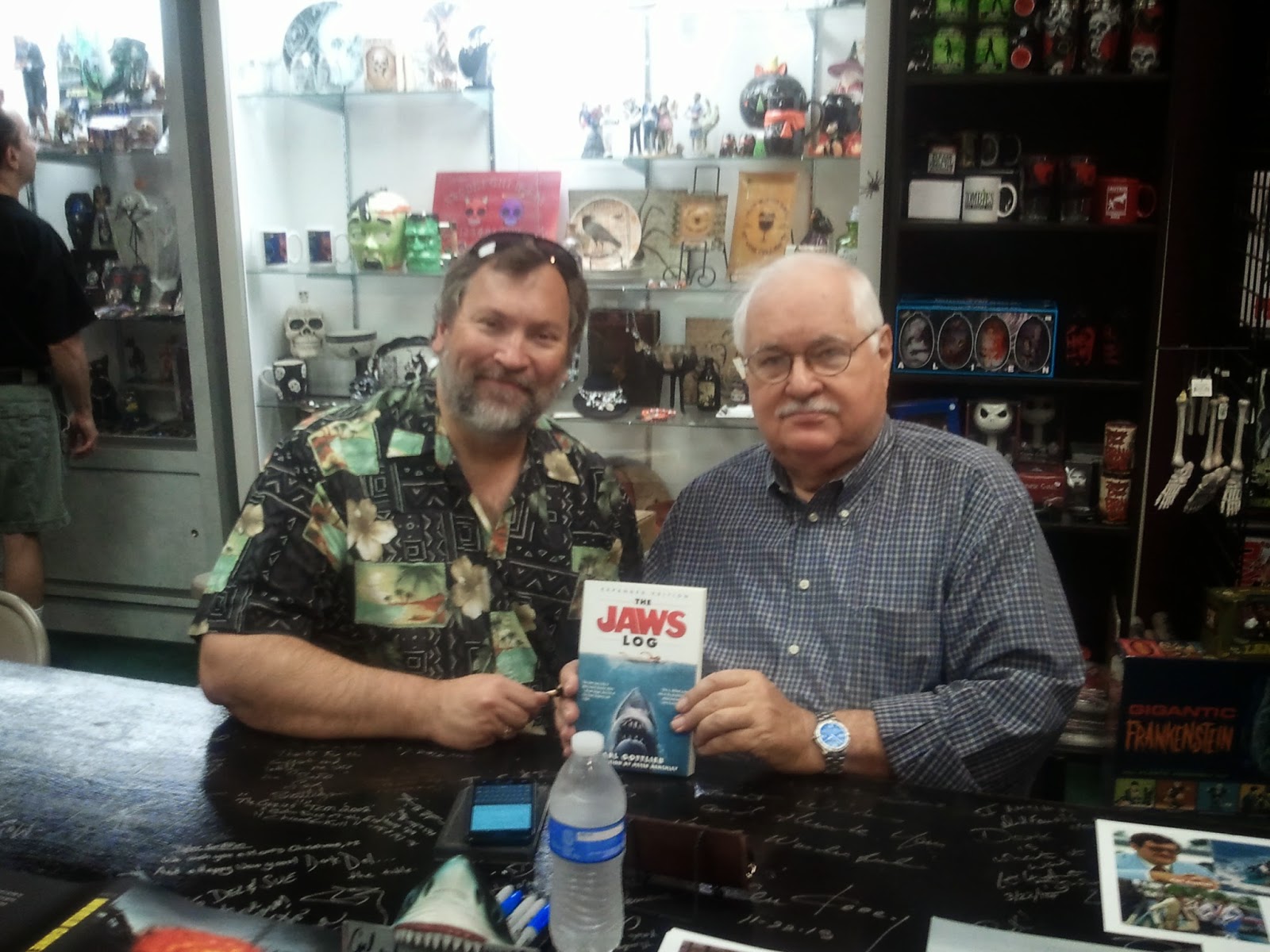 My blogging colleague at “It Rains, You Get Wet“, posted a notice that Carl Gottlieb would be at an authors signing at “Dark Delicacies” a horror themed bookstore in Burbank this Saturday. After making sure I had no other conflicts, I hijacked my kid the fanatic and off we went. I’ts been years since I was in this part of town but she recognized it right away, having recently visited a vintage store that sells movie and TV castoffs. It was not hard to find, the Gothic Lettering stands out on the street.