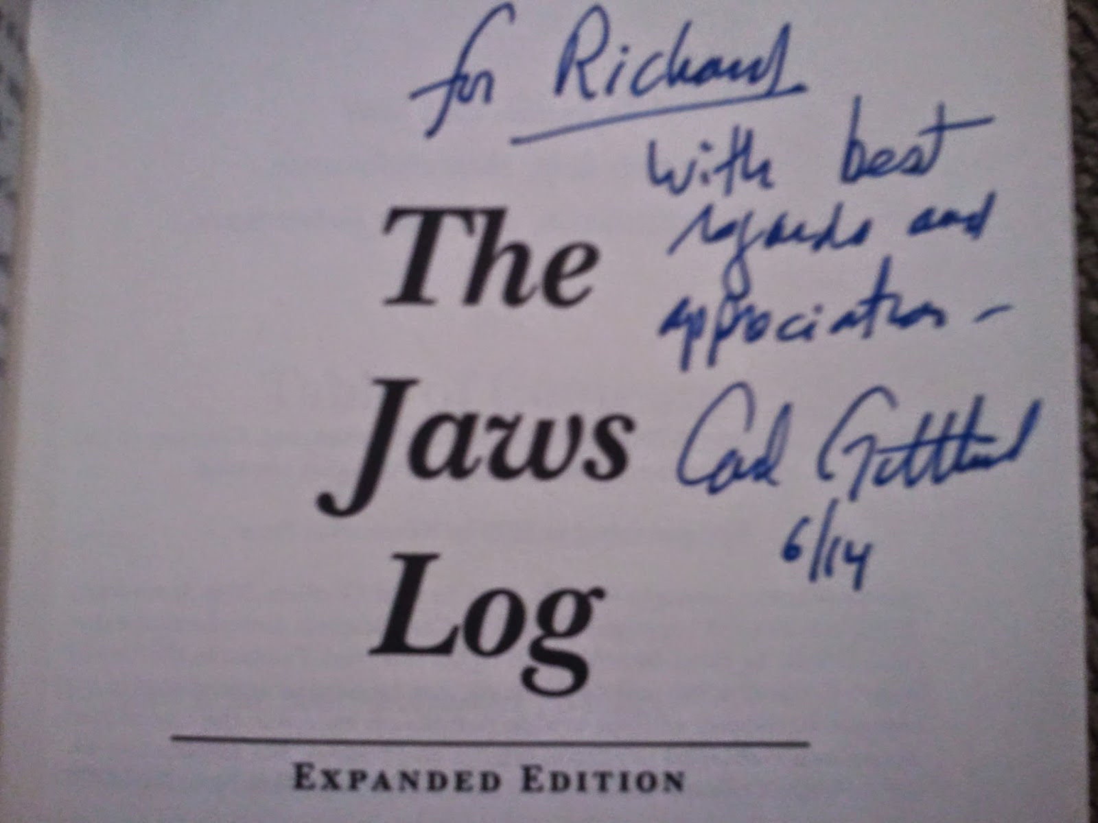 In case any readers were wondering, “JAWS” is my favorite modern film. Some day I will do the list that everyone else works up for their top ten, and depending on the day, “JAWS” will be either one or two on the list (because “The Adventures of Robin Hood” will have to fight for that spot as well). Five years ago, we saw “Jaws” at a screening on Sunset Blvd. at the Vista Theater. Mr. Gottlieb spoke for a couple of minutes before the movie and as the principle screenwriter for the film, we hung on every word. After the movie, my daughter (who is an even bigger “Jaws” fanatic than I am), had him sign her copy of “The Jaws Log”, the book he wrote about his experience working on the film (he also appeared on screen as the editor of the Amity Newspaper). I did not have the foresight to go out to the shed, dig through twenty boxes of books and locate my original paperback edition, so I missed out.