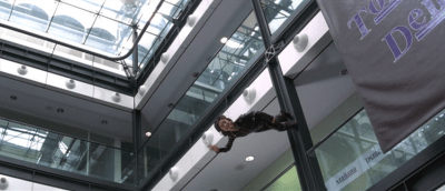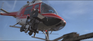 Sneaking past a helicopter flyng low requires being high. Fortunately for the two agents, they ended up on top of a building right across from another building of equal height.
