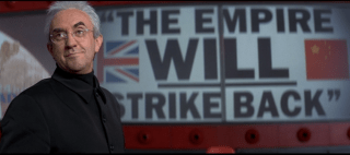 There is a horrible sequence where Bond and M are meeting in her car and they start trading quips. Moneypenny jumps in with a particularly leaden attempt to flirt and be clever. It is one of the most painful exchanges of dialogue I can think of in a Bond film. There is a much better piece of verbal humor later in the film. It still is a bit out of place, but it comes close to a line that I could imagine Sean Connery making work. As Bond and his Chinese counterpart are brought to the Saigon headquarters of media villain Elliot Carver, a giant banner with his image hangs off the building.