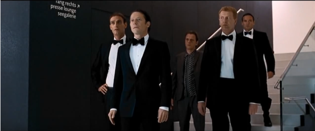 Bond juxtaposes his bad ass assassin facade with a jesters grin when he dispatches two killers sent to kill the widow of his first target. She claims that it will be a no use for him to intervene because in five minutes there will be another killer at her door. His response “Just enough time for a drink.” A little gallows humor to ingratiate himself with a key informant. Thank you Mr. Bond. When he boldly bluffs his way into a secret meeting of the phantom group, he calls the screener an asshole as he introduces himself as Mickey Mouse, oh yeah, in Italian. When the head of SPECTRE reveals himself at the meeting to James, he does it with a little cuckoo call. The bad guys have a sense of humor as well.