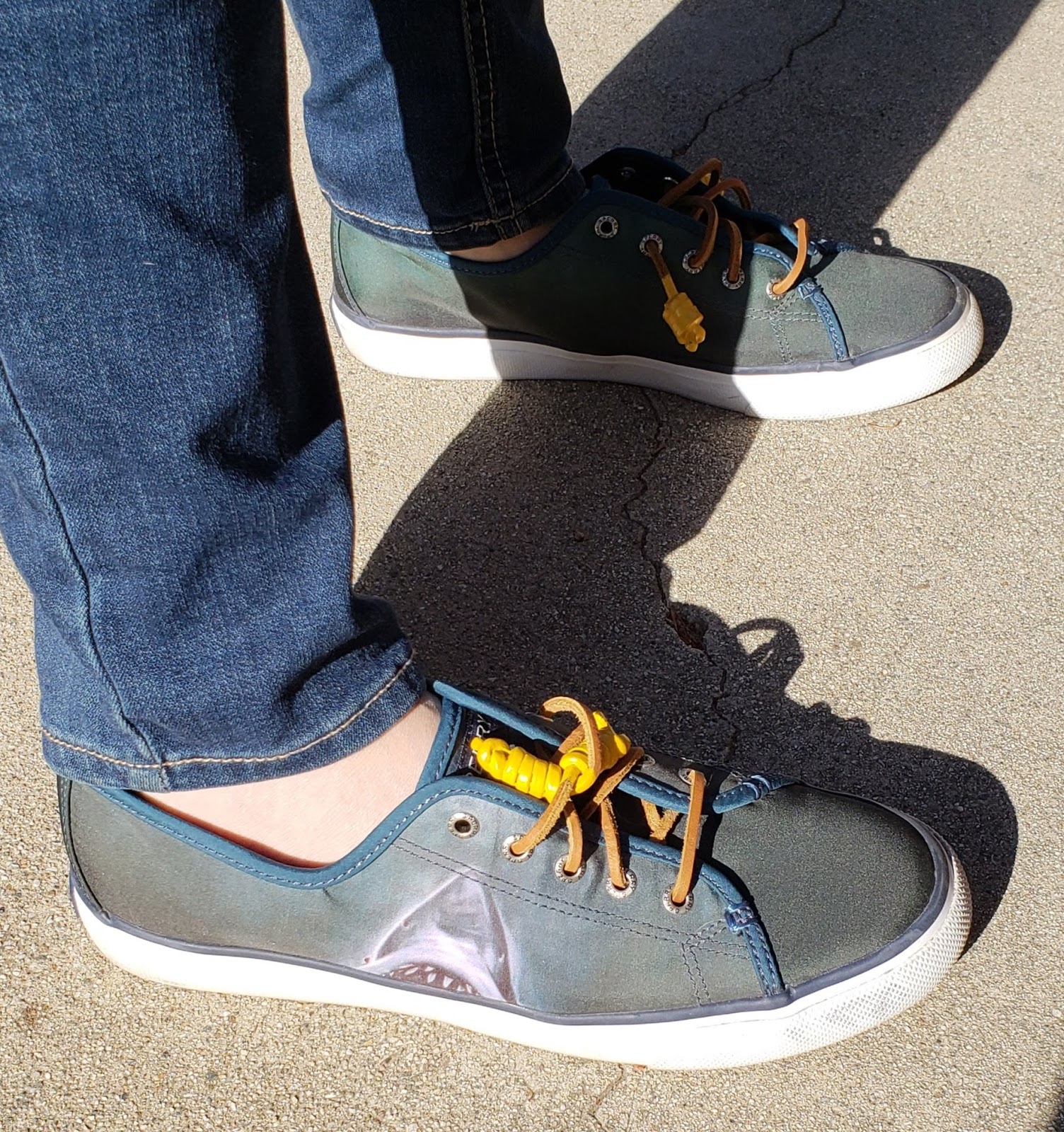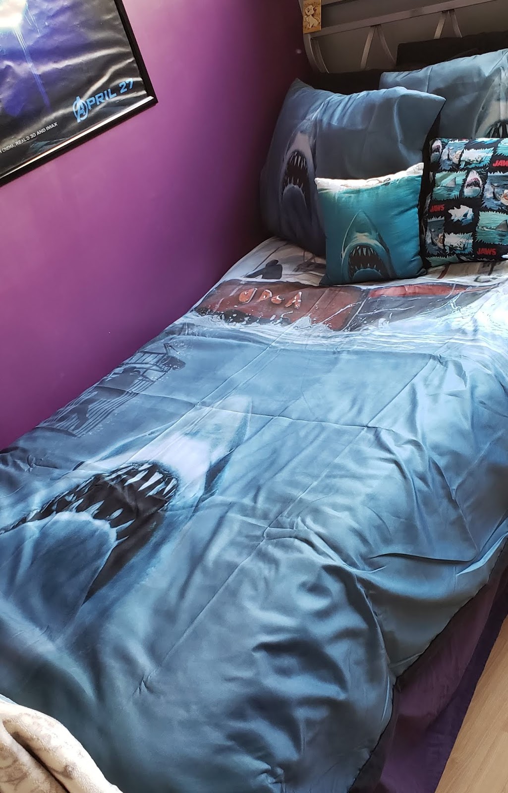Check out these kicks. The tie ends of her shoes are the barrels Quint uses to bring the shark to the surface. The inside sole of the shoe also has an image of the Beach Closed signs from the film. Saturday was her birthday, and she considers the movie to be a continuous gift that she receives every year. To feed that animal, check out the bed set that was one of my gifts to her .
