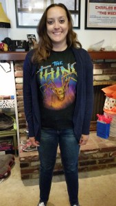 Since it is my daughter’s birthday at the end of the month, I gave her the gift I picked out a little early, it is a design from this scene on a great t-shirt provided by a company called Fright Rags. One of my online correspondents works for this company and they have licensed images from this movie that show how the practical effects look so much better, even when they are being rendered artistically.