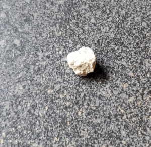 The above is a small piece of plaster that fell from the ceiling on me during the quake. I did not see any big chunks, just some flakes here and there, this is maybe a 1/4 of an inch in size.