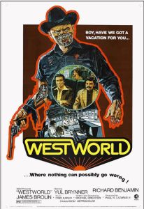Michael Crichton, the writer/director of Westworld, was a well known novelist making his directorial debut. He had written other highly entertaining films before this, including the Science Fiction technology thriller “The Andromeda Strain”. His milieu was technology and many of his well known books feature stories of technology going wrong; “Sphere”, “The Terminal Man”,”Congo”. The most successful movie made from one of his stories is “Jurassic Park” about an amusement park where science is not able to control it’s attractions. Basically, “Jurassic Park” is “Westworld” with dinosaurs. Everybody probably remembers that great line from Jeff Goldblum’s Ian Malcom, “Yeah, but, John, if The Pirates of the Caribbean breaks down, the pirates don’t eat the tourists”. It was actually the second time such a concept was used by him. Reportedly, Crichton was inspired to write “Westworld” after a visit to Disneyland where he was impressed by the animatronics in “Pirates of the Caribbean”.